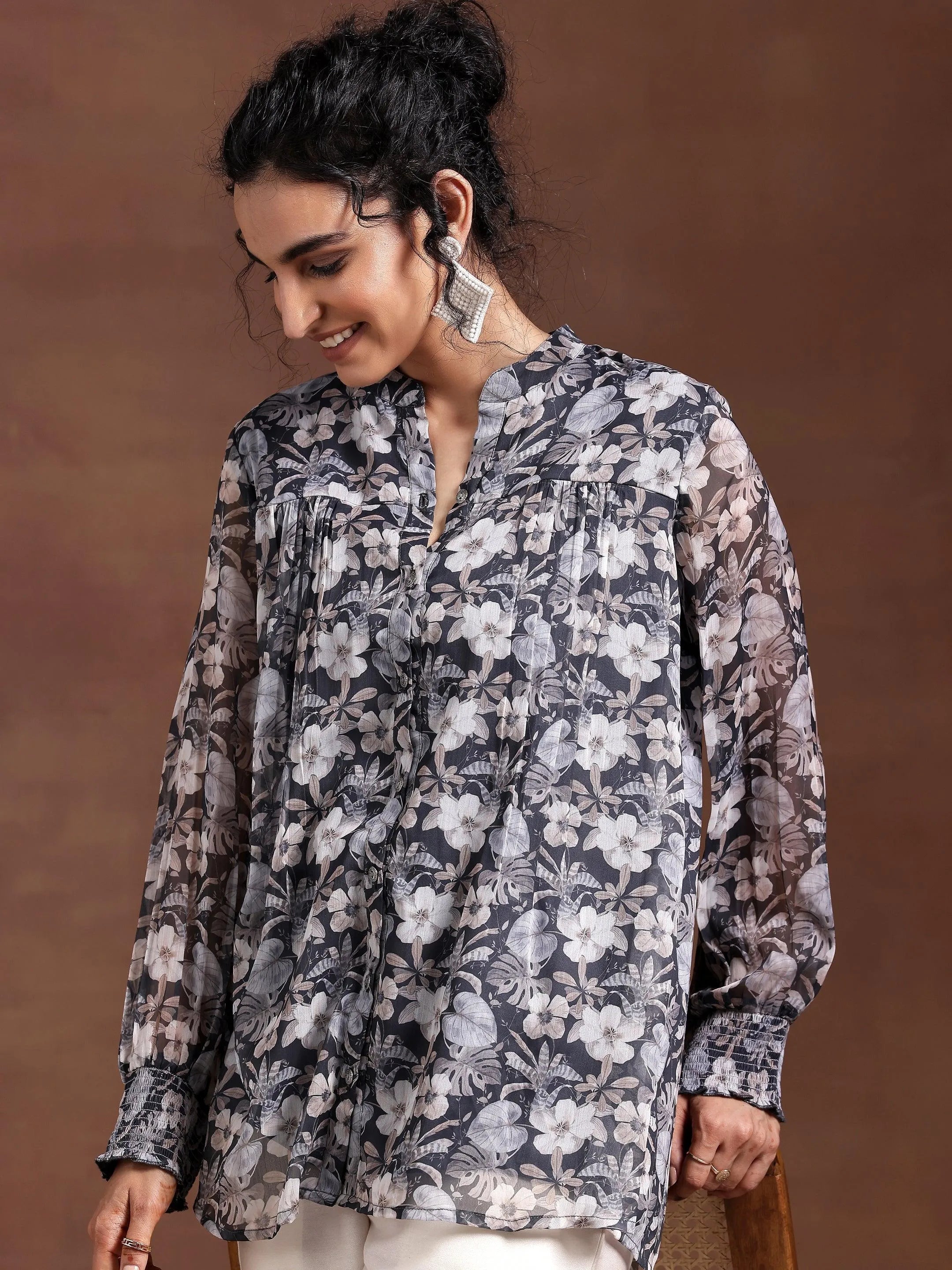 Our grey printed polyester kurti features a mandarin notched neckline and comfortable full sleeves. Highlighted with floral prints and stylish buttons, this style is perfect for casual outings.