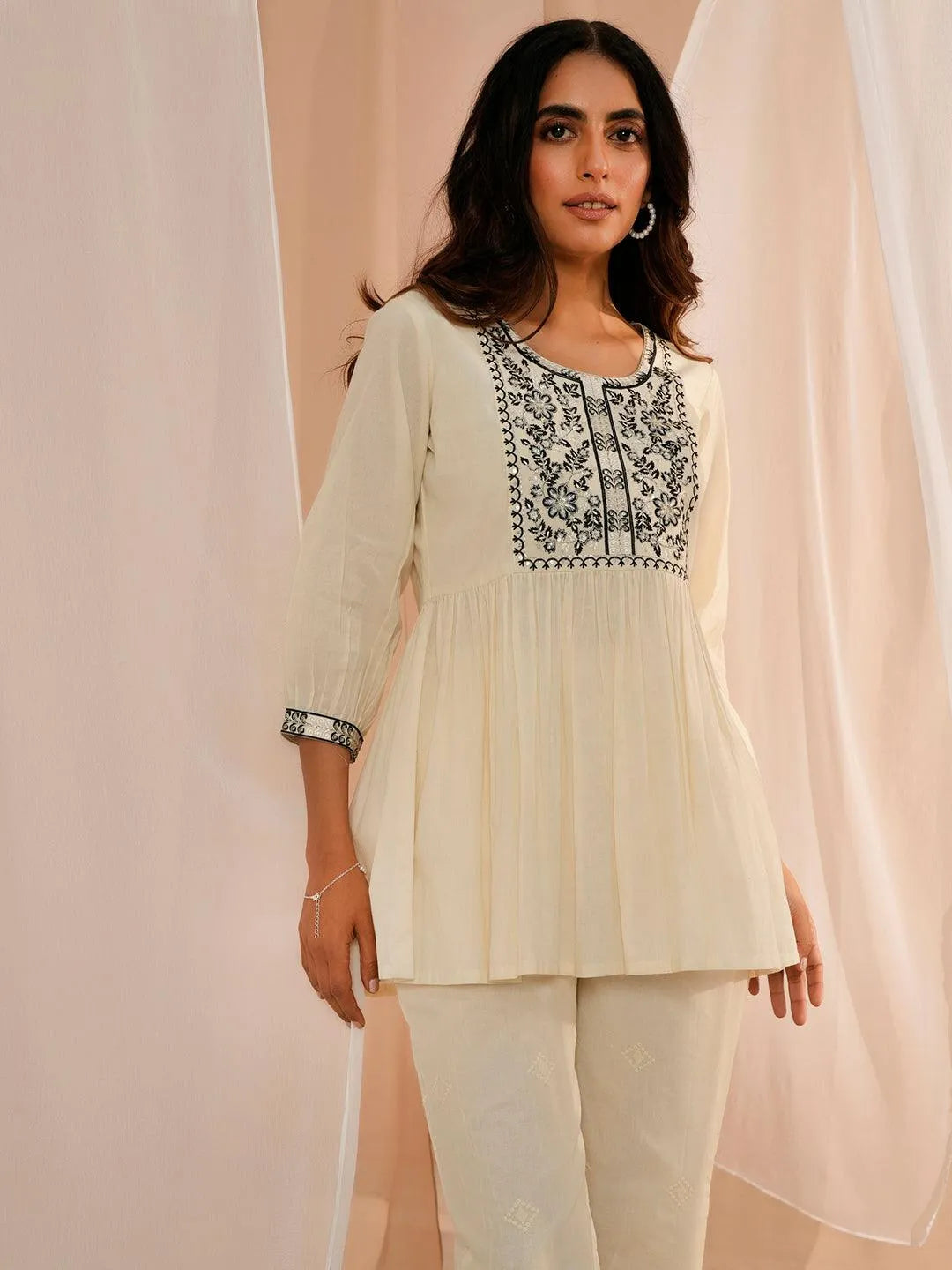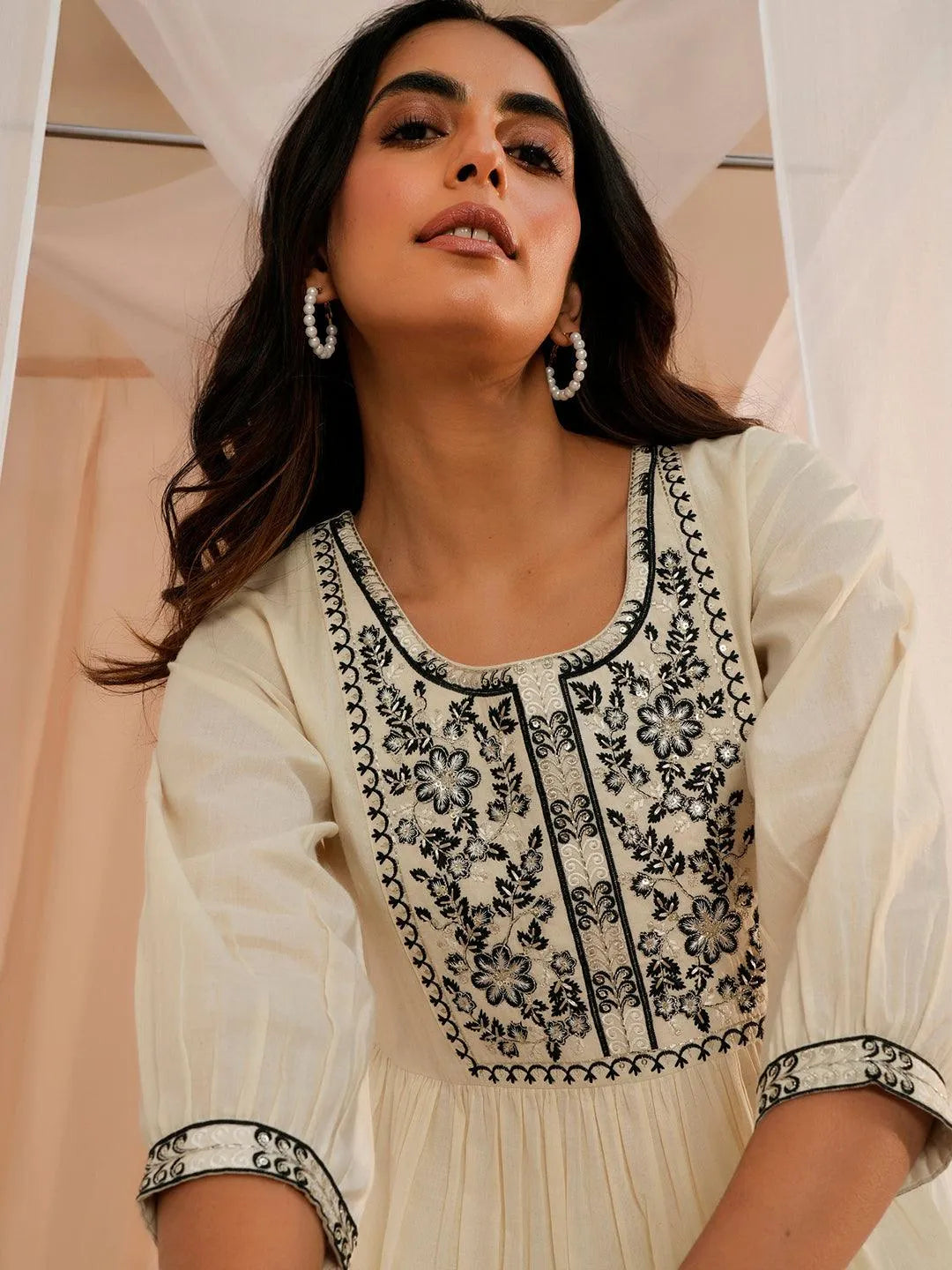 Our off-white embellished A-line kurti, crafted in cotton fabric, features a round neckline, three-quarter bishop sleeves, and a statement yoke. Adorned with captivating embroidery and sequins, this style is perfect for casual outings.