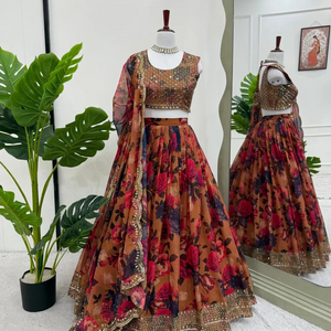 Where florals meet finesse, this stunning lehenga is a celebration of timeless beauty and modern grace. Crafted in tabby organza with rich digital floral prints, paired with intricate thread and sequin embroidery, this ensemble flows effortlessly with every movement. Perfect for weddings, festive soirées, and unforgettable evenings—because elegance should always feel this effortless.